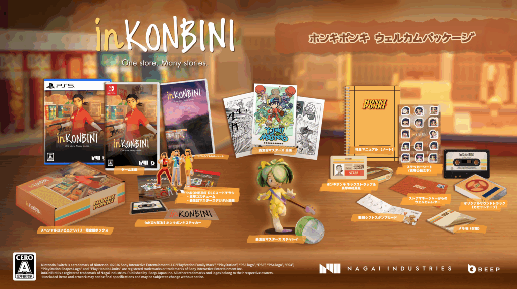 2026年3月4日(水)東京 – 開発会社Nagai IndustriesとパブリッシャーBeep Japanは、本日配信されたNintendo Indie Worldショーケースにて、『inKONBINI: One Store. Many Stories』の発売日が2026年4月30日に決定したことを発表しました。対応プラットフォームはPC(Steam)、Nintendo Switch、PlayStation 5、Xboxです。あわせて、パッケージ版の発売日は2026年6月18日となり、予約受付も開始いたしました。